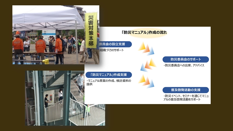 不安に駆られると、どうしても「物」に頼りがちになってしまいます。しかし重要なのは、非常時に発揮できる行動力と、住民間のつながりです。しくみづくりや人づくりに軸足を置いた、実践型のコンサルティングを実施します。マンションをはじめ戸建て住宅街の自治組織、まちづくり協議会など、様々なコミュニティに対応します。